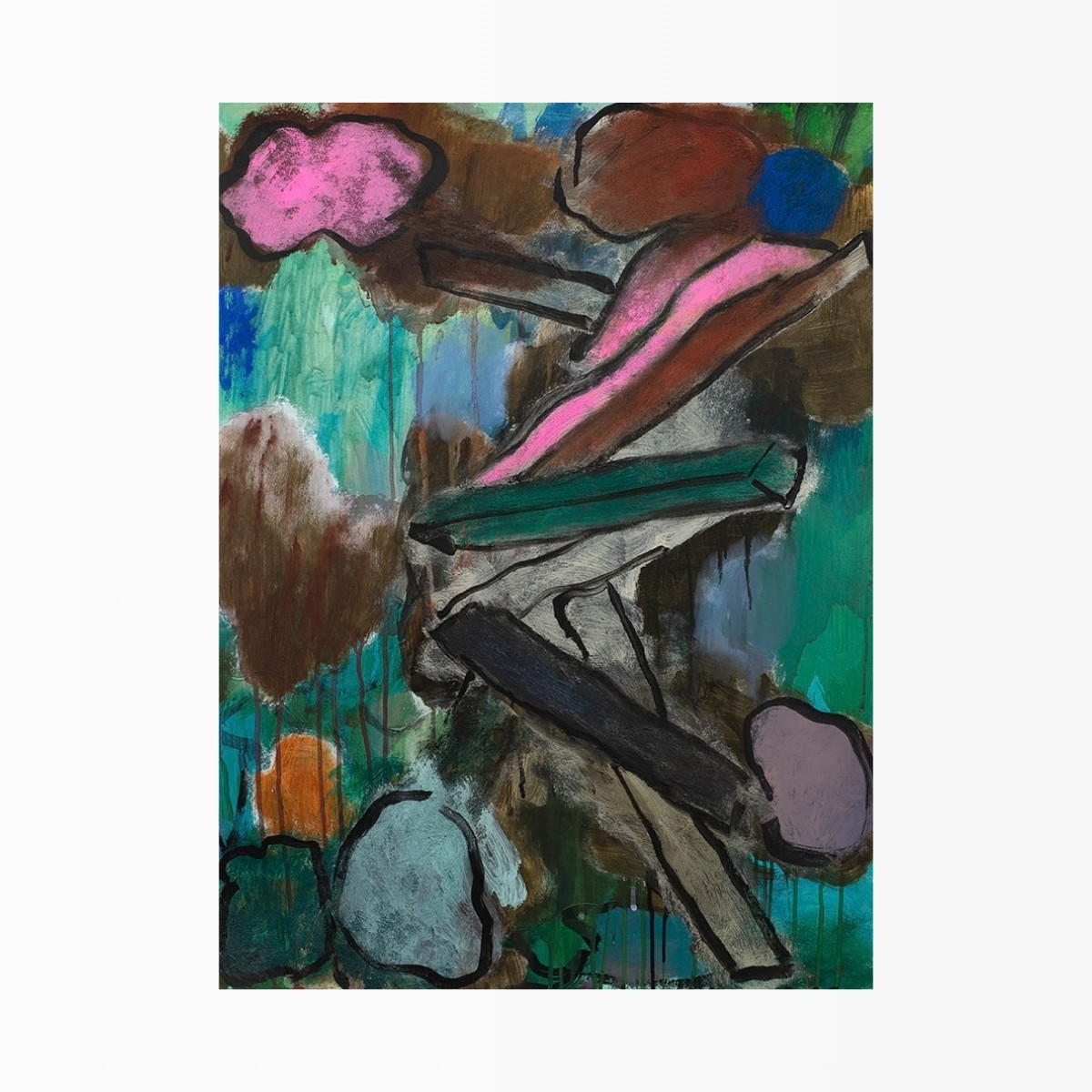 As I don’t pre-plan these works, sometimes they take a long journey to get to their end. This work really came into being through a form-finding process. Playing with chunks of colour, layers of transparency and seeing how they interact. I enjoy forms that feel solid but un-namable.